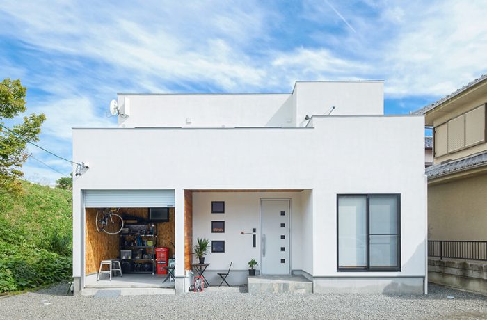 真っ白い立体感のあるファサードは、青空が良く似合うガレージのある家。シンプルで爽やかな印象の住まいは家族の笑顔が溢れる家となりました。
