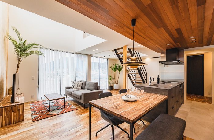 縦にも横にも視線が抜ける、開放的なLDK。素材の魅力を最大限表現したこだわりのコーディネートや、快適な暮らしのための優れた家事動線など。こだわり満載の住まいが完成しました。