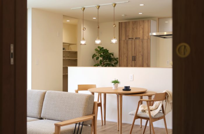 愛猫がのびのびと室内を歩く姿を想像できる広がりある室内。照明計画や、ドアノブの小さなデザインまでこだわった上品で穏やかな印象の住まいが完成しました。