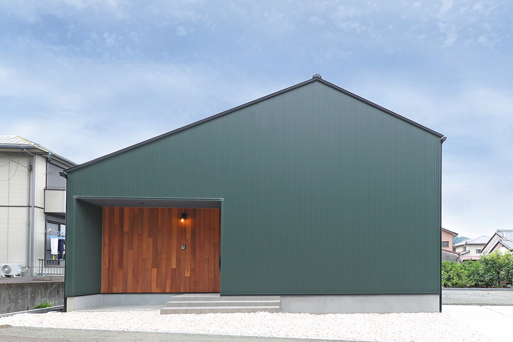 建築家と叶える理想の住まい。 三角屋根とモスグリーンの外壁に天然木の組み合わせが目を惹く外観。 ”楽”を実感できる回遊動線のある間取りや、お施主様設計の造作家具など。 理想を共に創り上げたこだわりの家が完成しました。