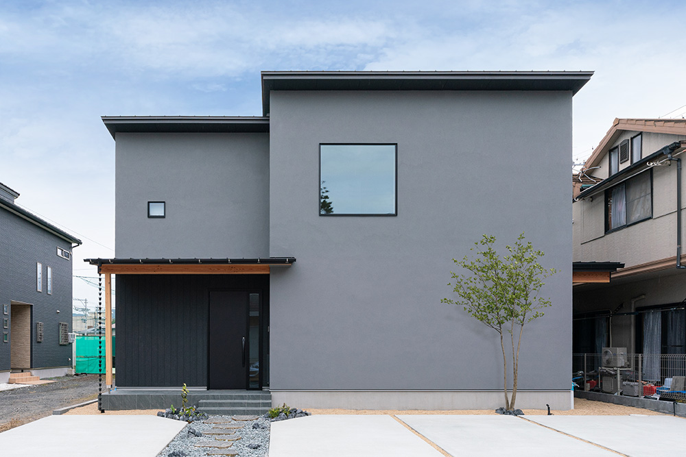 建築家と叶えた30代ご夫婦の理想の暮らし。焼杉を表現した素材と、ライトグレーの塗り壁を組み合わせた上品な印象の外観。塗り壁や障子、畳リビングなど「和」の要素をふんだんに取り入れ、建築家ならではの居心地の良さを感じるためのアイデアが込められた空間。