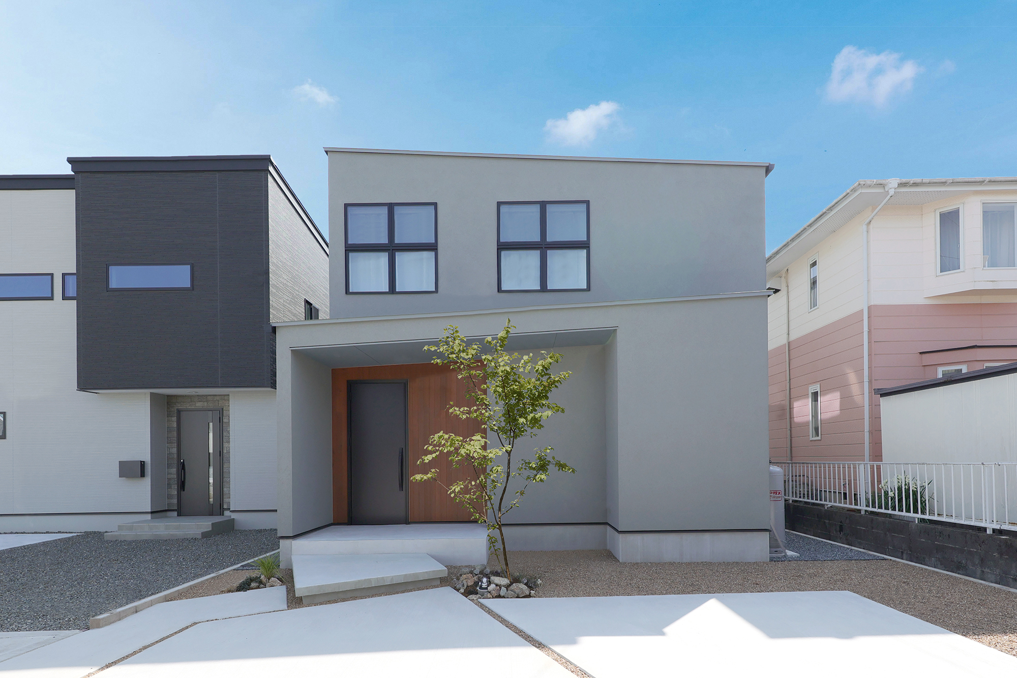 ライトグレーの塗り壁と天然木を組み合わせたファサードデザイン。