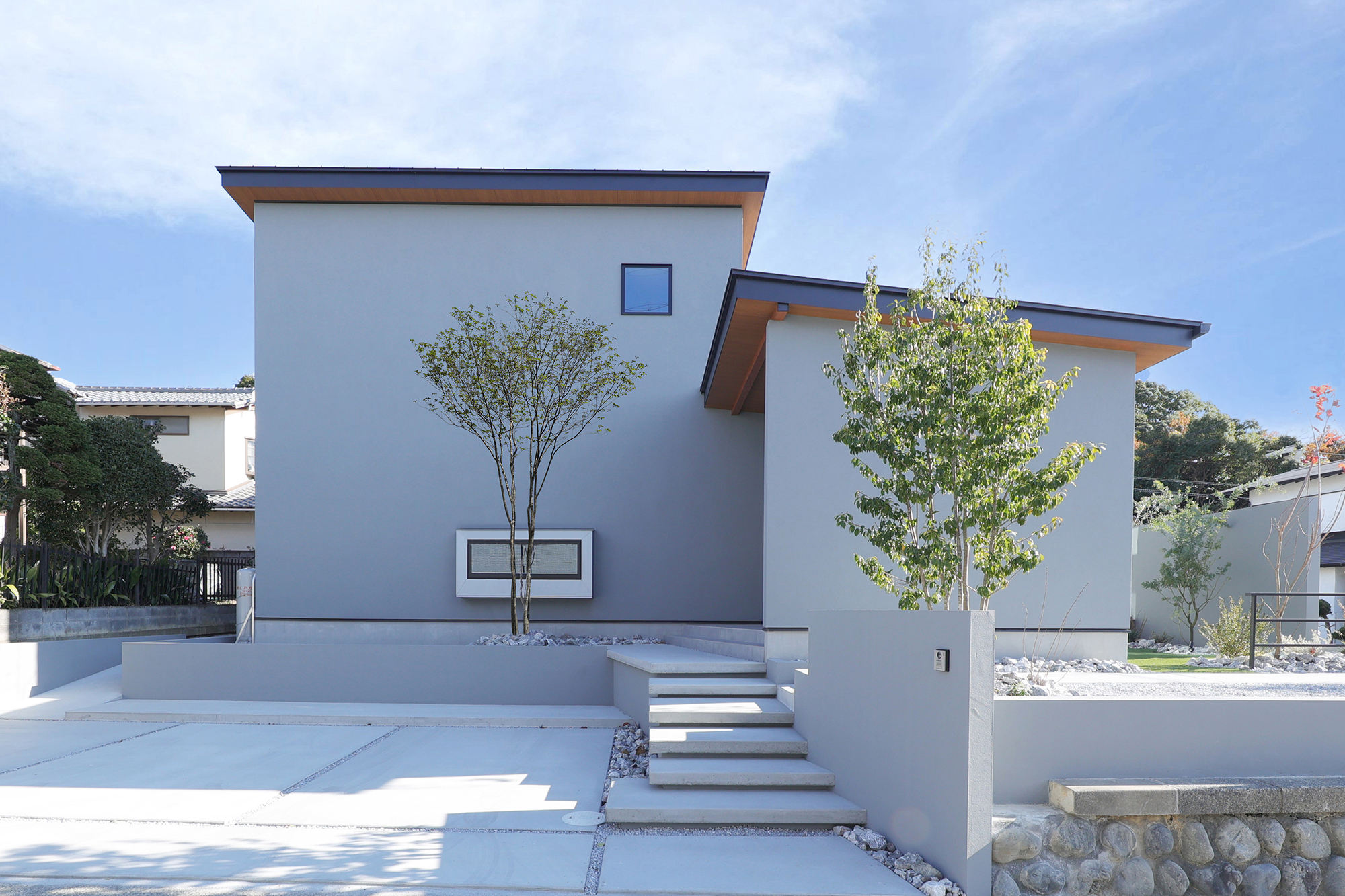 グレーの塗り壁と木製ドアや軒天の板張りでコントラストを演出。