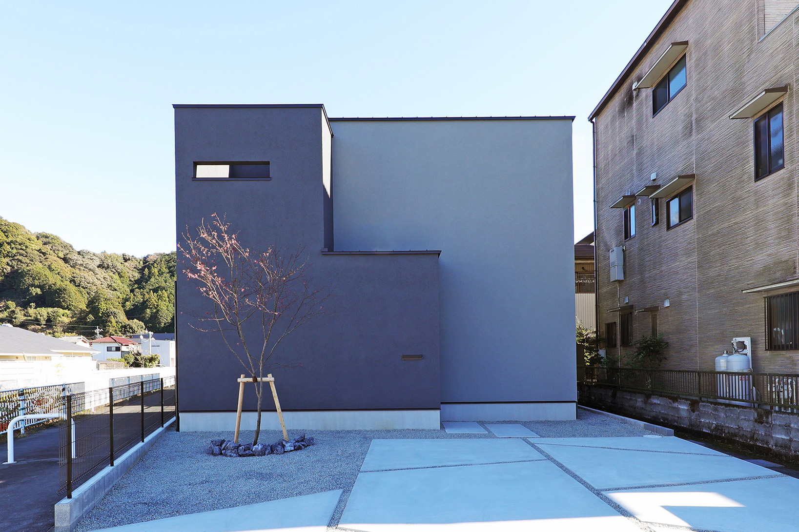 グレーの塗り壁で仕上げたキューブ型の外観。